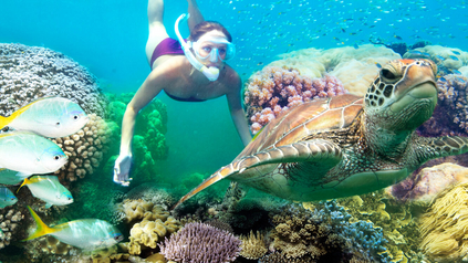 在大堡礁主要是通过浮潜的方式欣赏海底的巧夺天工的惊艳。浮潜是佩戴面罩,嘴里含一根通气管,趴在水面,头部埋进水中,通过佩戴的面罩观看水下景观的一种方式。